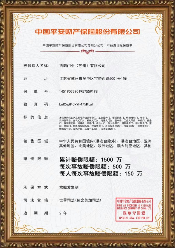 作为定位中高端的工业门品牌,西朗始终坚持品质为先、技术为本。产品严格按照国际标准设计生产,拥有CE 认证、ISO9001 质量管理体系认证、CMA 权威检测报告等多项资质,全系列产品投保1500 万元产品质量保险,从材料选用、结构设计到生产工艺,均执行高于行业的内控标准,确保每一套门在高频使用、复杂环境、严苛工况下稳定耐用,真正满足中高端客户对安全、效率、寿命与体验的综合要求。