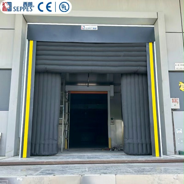 充气式门封表面为高质量氯丁纤维橡胶高耐磨材料,可满足不低于3 万次的使用寿命。两侧与顶部气囊在充气后将车厢尾部牢牢包裹,两侧气囊采用L 型结构,保证两侧气囊底部与墙体之间形成严实密封。宽度调节范围达1600mm,顶部气囊长度调节范围1200~1500mm,适用于各种货车底盘高度。