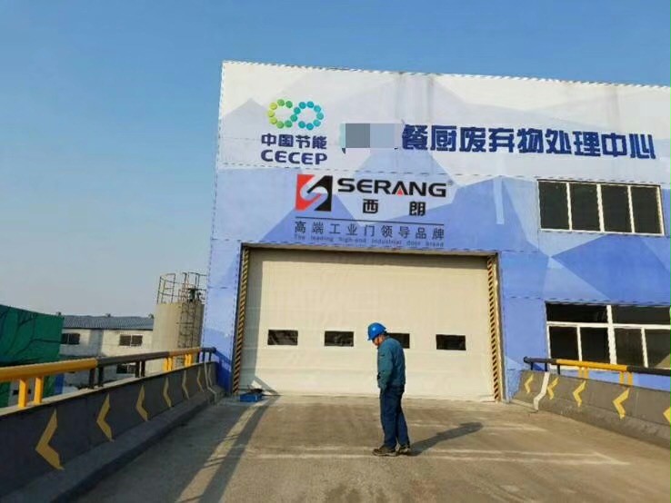 下图:中节能餐厨厂房户外选用背带堆积式快速门,室内选用pvc柔性快速卷帘门