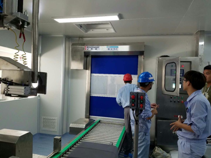 上图:SERANG(西朗)不锈钢防爆快速门与传送带联动调试。