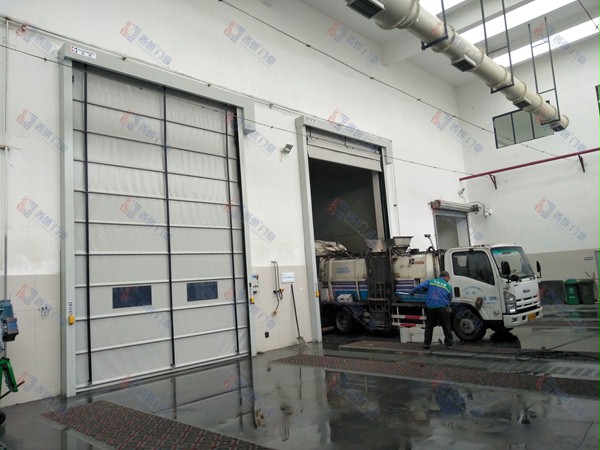 下图:餐厨厂房通道拉链快速门配合垃圾餐车联动。