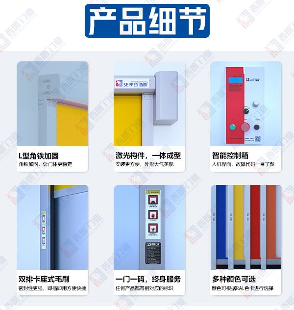 门帘材料:快速门采用法国品牌希运门帘,厚度可达1.2mm。