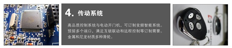 高品质控制系统与电动开门机,可订制变频智能系统。预留多个端口,满足互锁联动和远程控制等订制需要。金属和尼龙材质多种滑轮。