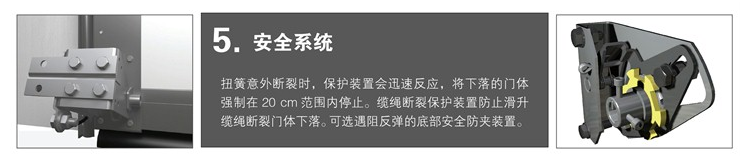 扭簧意外断裂时,保护装置会迅速反应,将下落的门体强制在20 cm范围内停止。缆绳断裂保护装置防止滑升缆绳断裂门体下落。可选遇阻反弹的底部安全防夹装置。