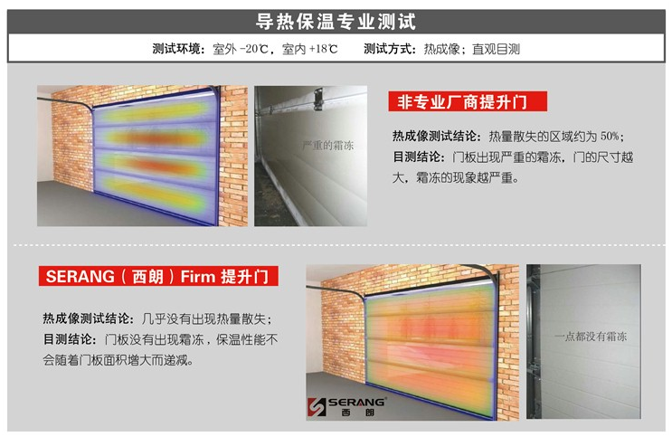 工业提升门的保温性能很重要,SERANG(西朗)工业提升门开发的保温型门板,能够更好地保温防止温度流失,下图为专业保温测试: