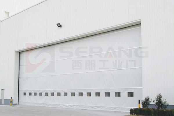 宁波西朗门业生产的柔性提升大门,由多层抗风机构、可升降式吊柱、提升驱动系统、导向密封系统和电控系统组成,具有占地面积小(不需门库)、无地轨、结构新颖、抗风、隔音、保温等优点。由专用起升机构来实现大门的升降启闭,通常用于大跨度洞口以替代钢大门。广泛适用于飞机库、船厂、大型机械的喷砂、喷漆及维修车间、大型展馆区域隔离等。