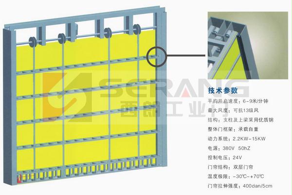 门向上垂直提升,门两侧无需预留开门空间,门体在门洞上沿堆积,不需预留很高的空间,密封保温性非常好,工作温度在-30℃-70℃之间。也可根据特殊要求增加防红外等隔热阻燃材料,操作灵活方便。