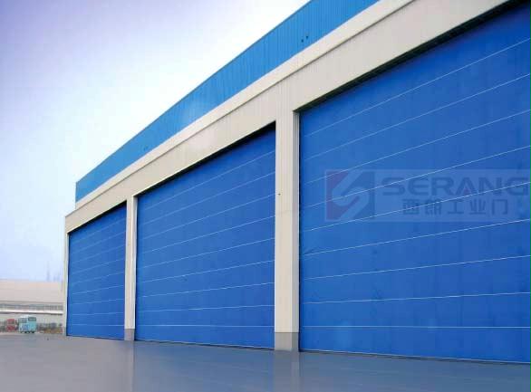 苏州西朗门业生产的柔性提升大门由多层抗风机构、可升降式吊柱、提升驱动系统、导向密封系统和电控系统组成,具有占地面积小(不需门库)、无地轨、结构新颖、抗风、隔音、保温等优点。由专用起升机构来实现大门的升降启闭,通常用于大跨度洞口以替代钢大门。广泛适用于飞机库、船厂、大型机械的喷砂、喷漆及维修车间、大型展馆区域隔离等。